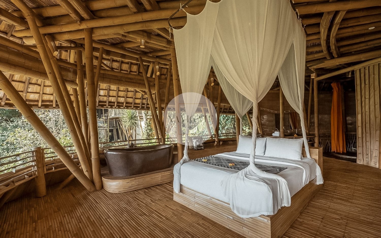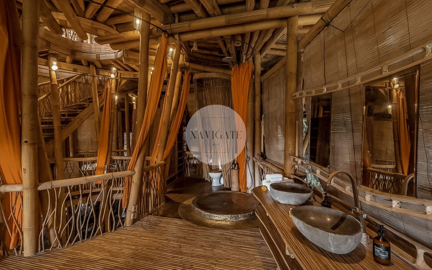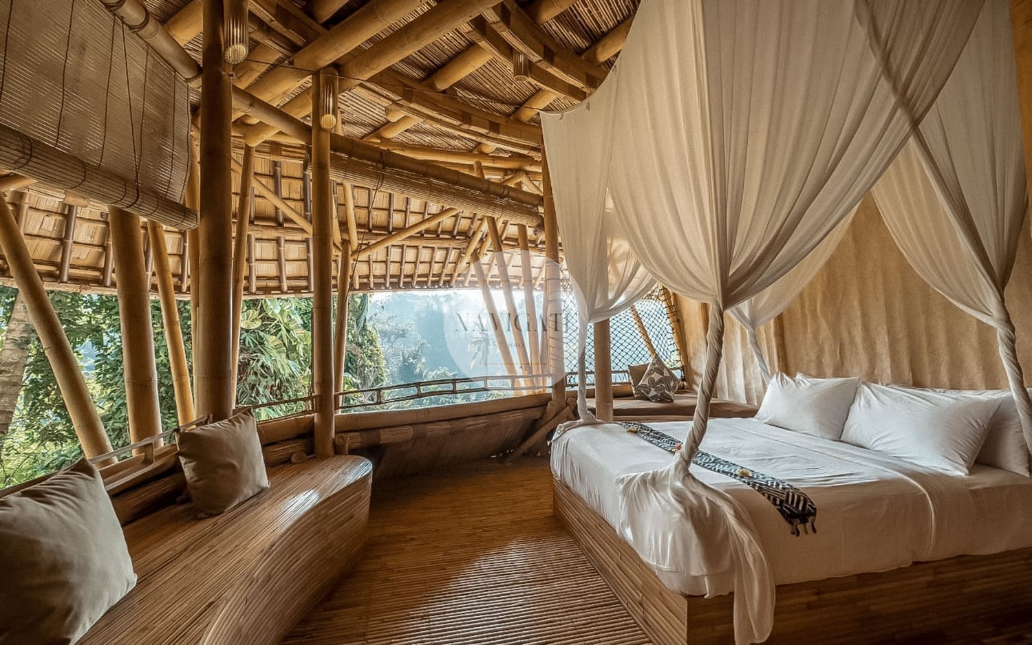 Villa Daun in Sibang is an extraordinary four-storey bamboo residence whose architecture is uniquely shaped like a leaf, blending harmoniously with nature while offering modern comfort. Rising gracefully above the jungle canopy, the villa opens to sweeping sunrise views over the Ayung River valley. Set within a vibrant community compound, it is not only a private sanctuary but also a gateway to shared experiences, with access to a large communal pool and a diverse program of activities such as yoga sessions, cultural workshops, river walks, communal dinners, and engaging kids’ programs.