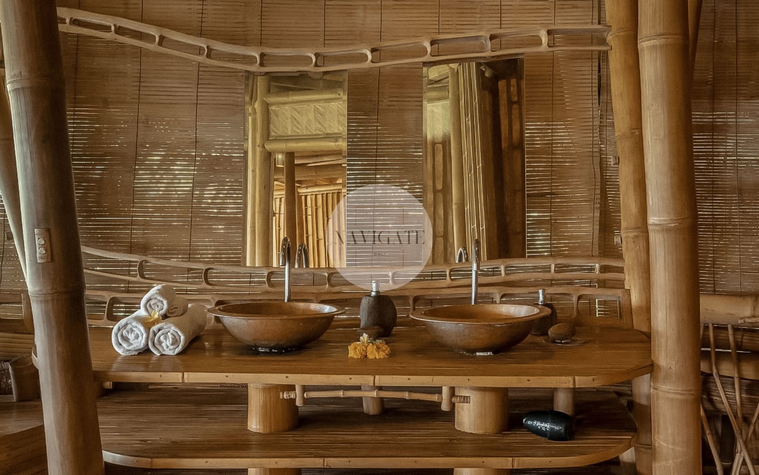 Designed to accommodate families, the villa offers three en-suite double bedrooms. The second floor hosts two bedrooms cooled by ceiling fans, with a reading room in-between, while the master suite occupies the bottom floor, complete with air conditioning, a dehumidifier, and direct access to the outdoors. Each bedroom is fitted with bamboo blinds, ensuring privacy and restful nights surrounded by nature’s sounds.