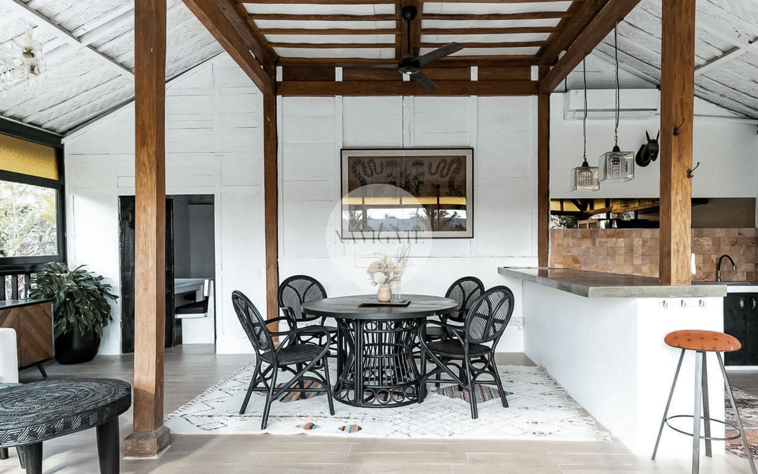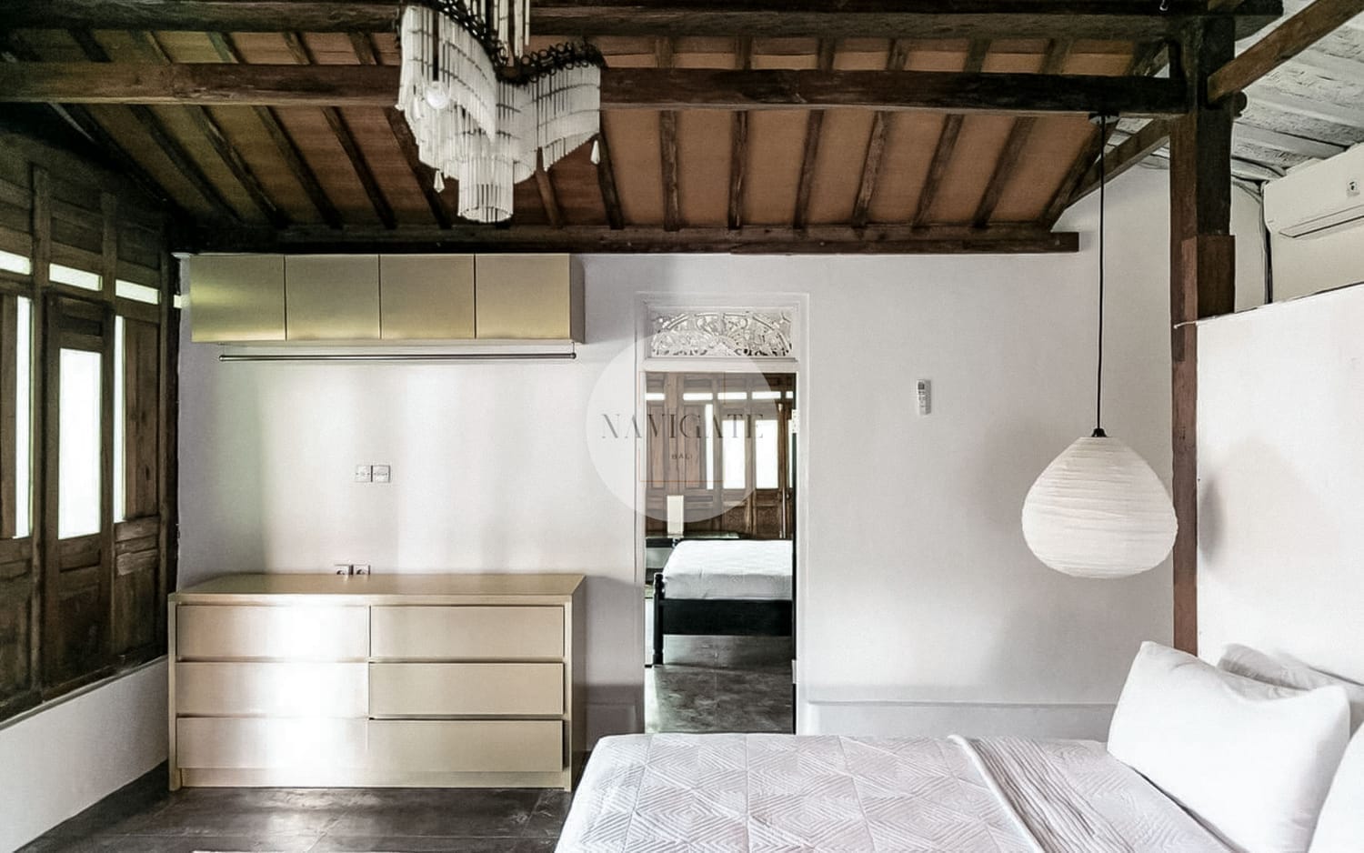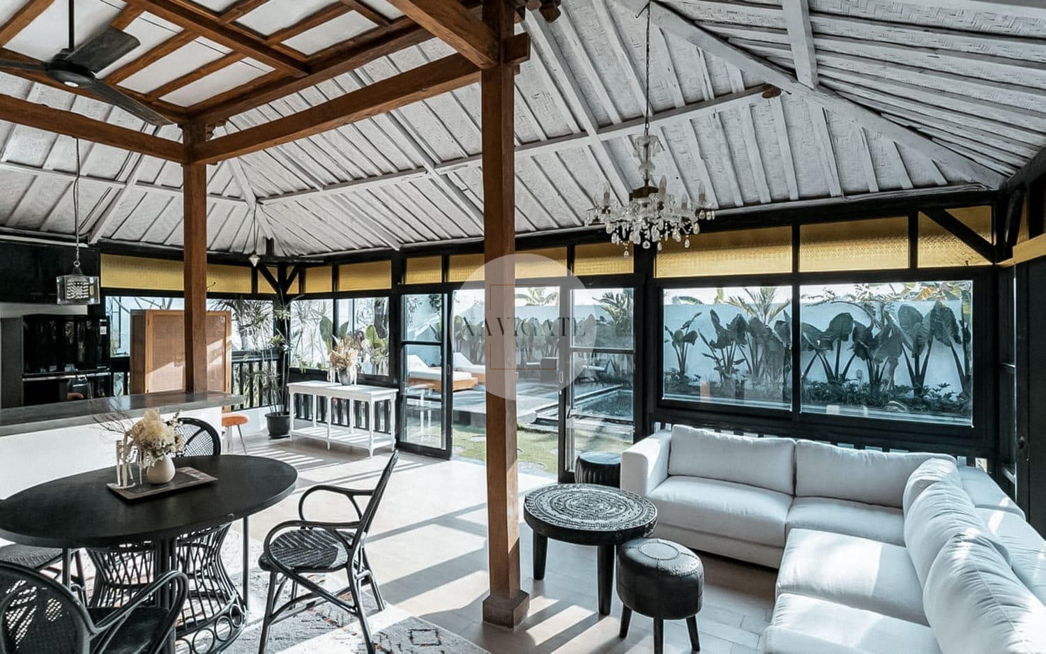 The villa features three well-appointed bedrooms—two positioned side by side and one set off the main living area—each complemented by its own bathroom for privacy and convenience. The enclosed living space showcases the rich character of Joglo architecture, with intricate wooden details and an inviting atmosphere. A fully equipped kitchen ensures effortless meal preparation, while the villa comes fully furnished, combining elegance with practicality.