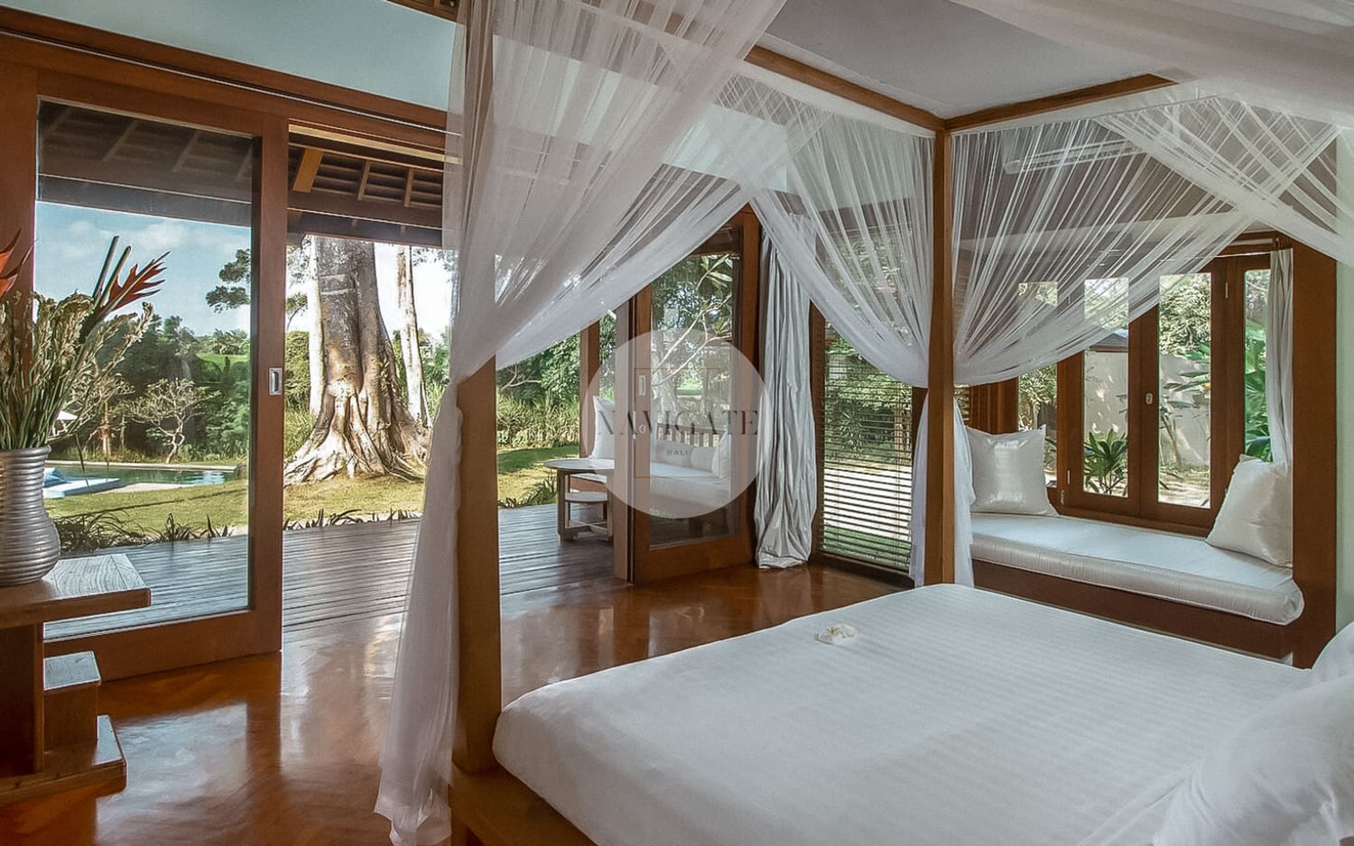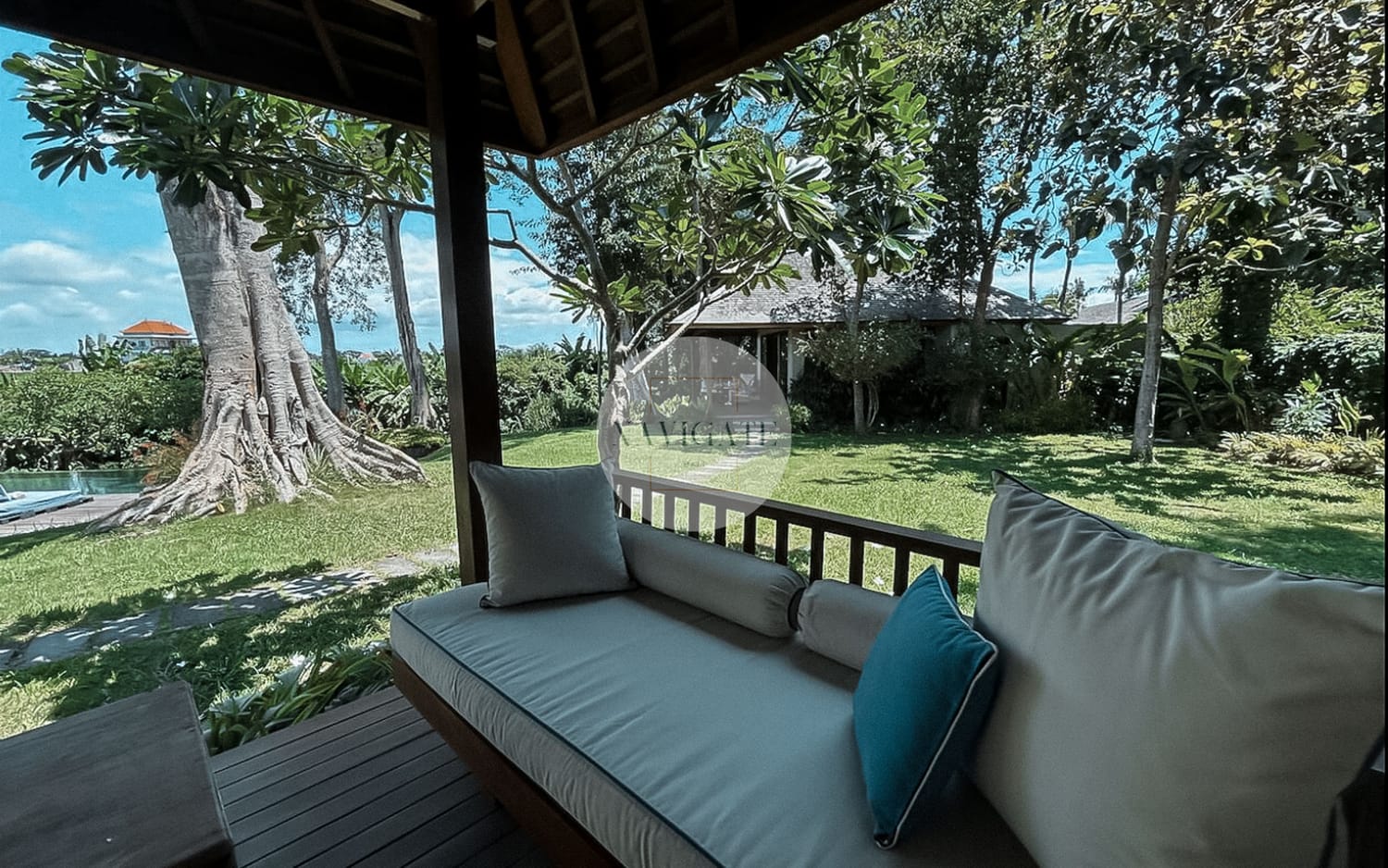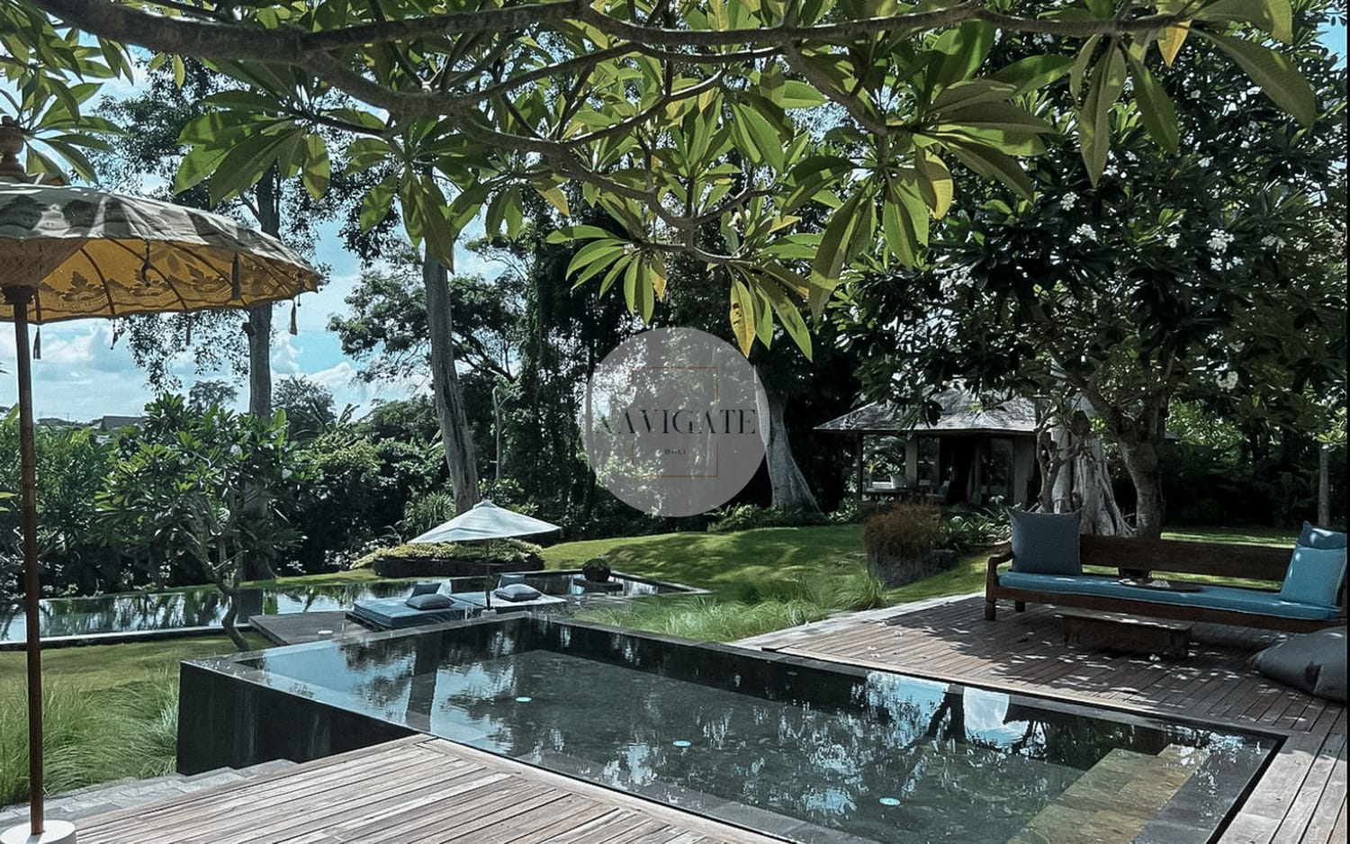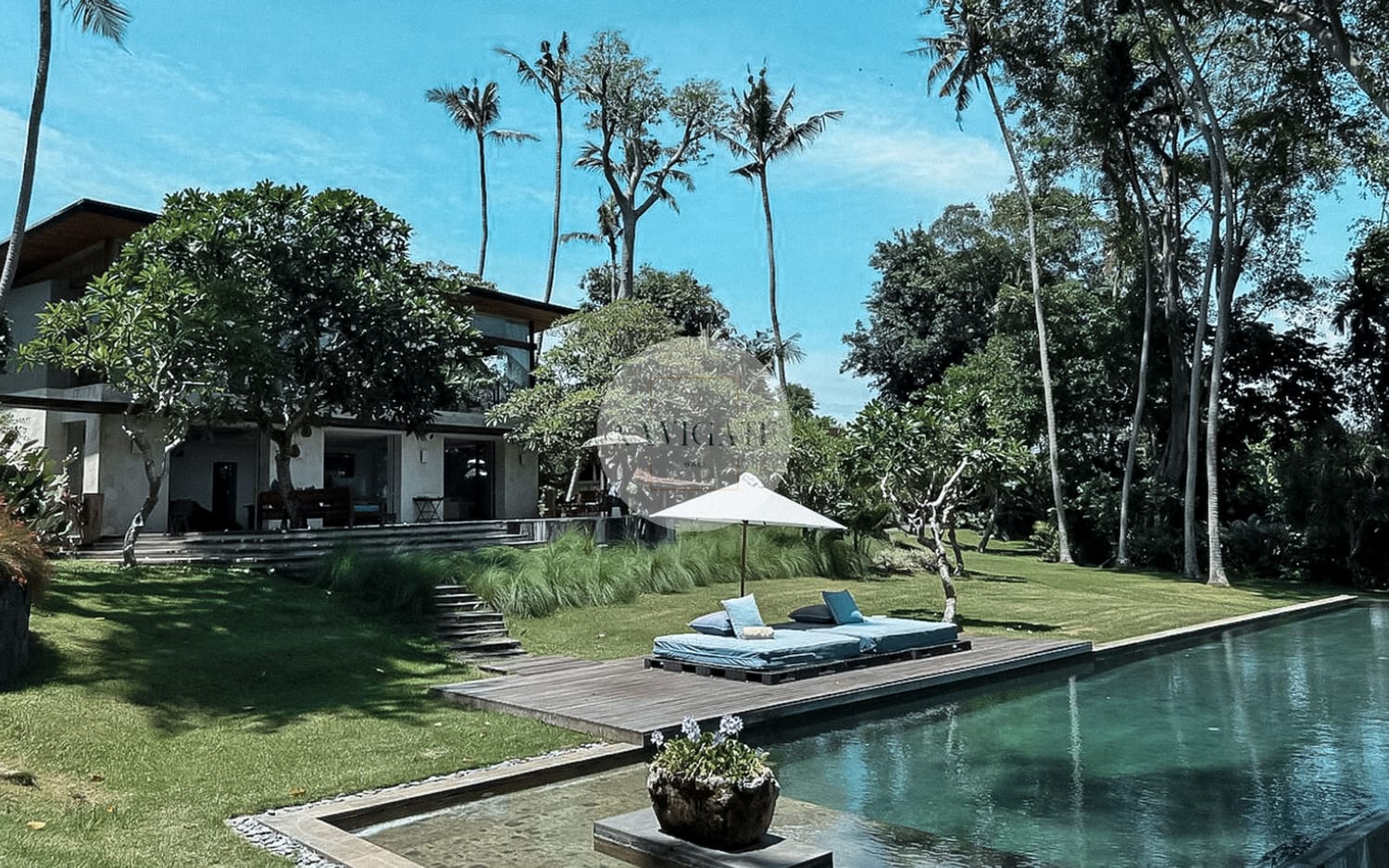 Comprised of 5 luxury bedrooms with privacy in mind and 180-degree views of rice fields stretching infinitely towards Mount Agung and the ocean as the beach is 300 meters from the main entrance.