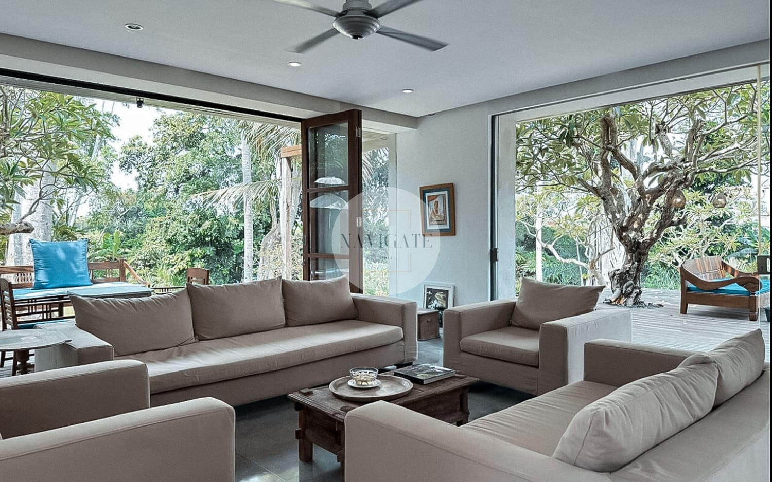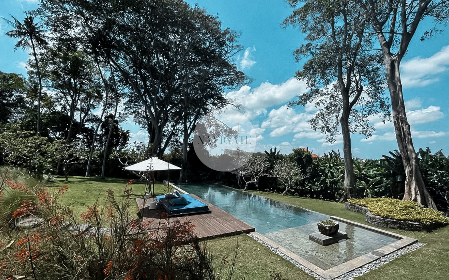A main two-storey building houses two bedrooms with en-suite bathrooms along with the enclosable living, dining, kitchen and media room. The other three bedrooms with en-suite bathrooms are tucked away in the remainder of the 5,000 square meter estate in separate three pavilions of its own.